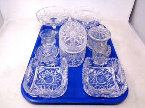 A tray containing assorted cut glass lead crystal including lidded jar, preserve pots, comport, dishes etc.