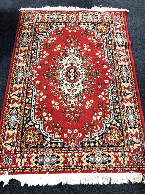 Two woolen rugs with central medallions on blue and red ground.