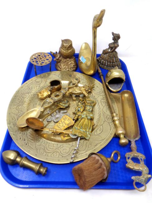 A tray containing antique and later brass ware including Indian brass plates, bottle openers, a corkscrew, companion pieces, ornaments etc.