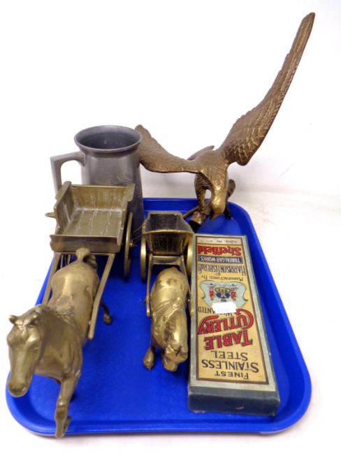 A tray of two brass horse and cart ornaments, pewter tankard, stainless steel butter knives etc.
