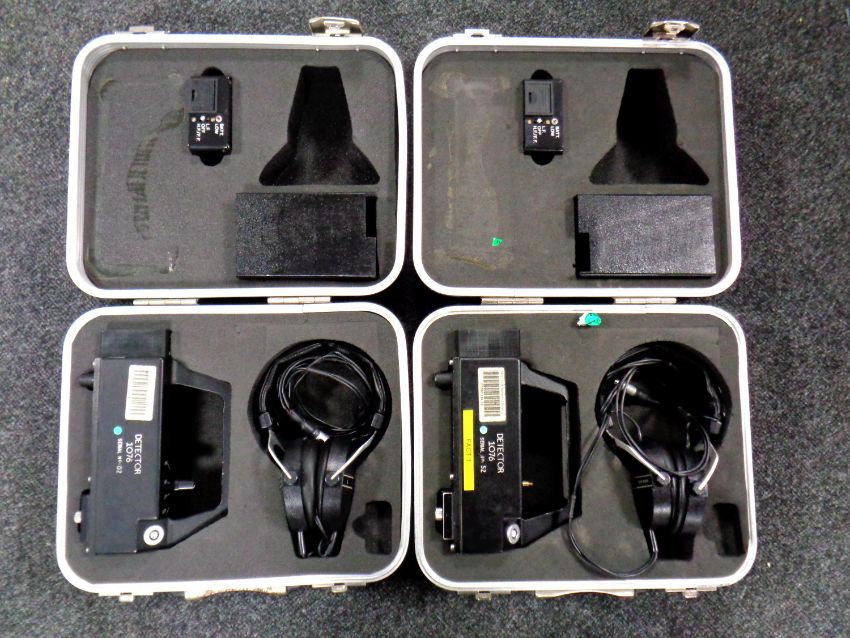 Two cased 1076 detectors serial numbers 52 and 02 with headphones.