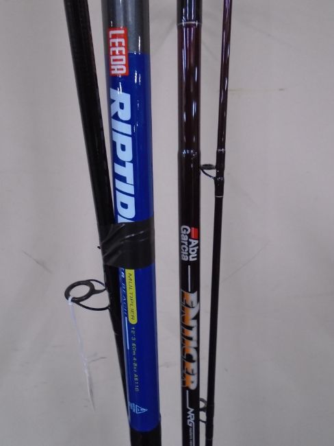 Two two-piece fishing rods, an Abu Garcia Enticer and a Leeda Riptide.