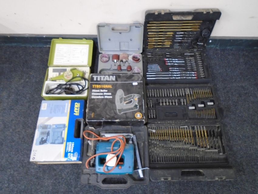 A box containing assorted boxed and cased toolkits, drill bits, Titan nailer, Powercraft chisel kit etc.