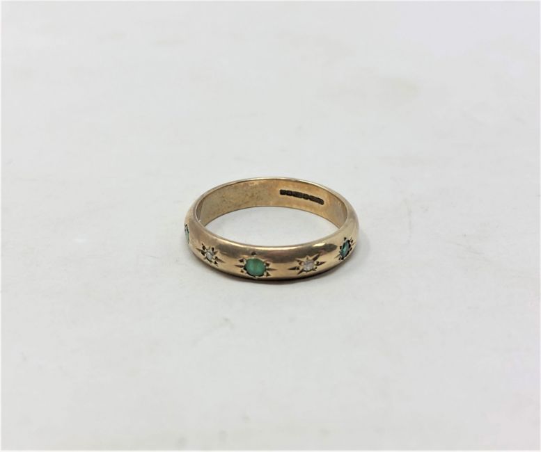 A 9ct yellow gold band ring set with emerald and diamonds, size J/K, 2.5g.