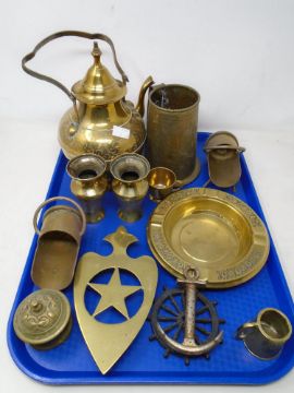 A tray containing antique and later brass ware including miniature coal helmets, ashtrays, eastern brass vases, teapot, trivet etc.