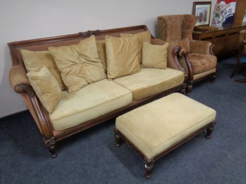 A Victorian style carved wooden frame settee with matching footstool upholstered in a two tone fabric, together with a matching wingback armchair in Paisley style fabric (3)