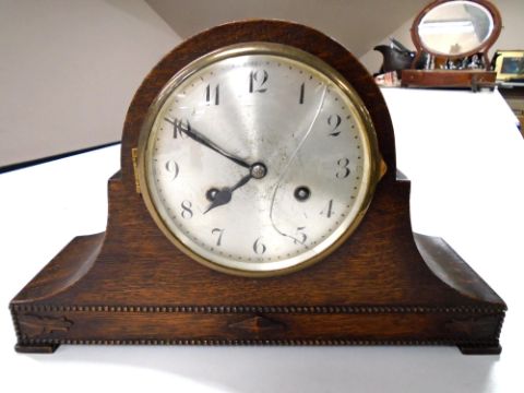 A 1930's oak cased 8-day mantel clock with silvered dial (a/f)