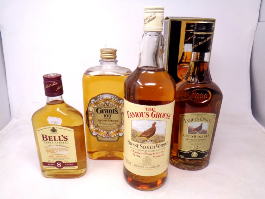 Four bottles of whisky including The Famous Grouse Gold Reserve Deluxe, aged 12 years (0.7 Litres, boxed), The Famous Grouse Finest Scotch Whiskey (1 Litre), Grant's 100 Superior Strength Scotch Whisky (1 Litre) and Bell's Extra Special Old Scotch Whisky, aged 8 years (0.35 Litres).