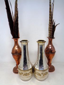 A pair of Dutch plated vases together with a further pair of brass Art Nouveau vases containing feathers.