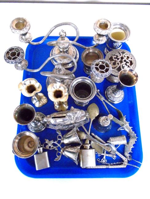 A tray containing assorted plated wares including vases, table candelabra, miniature wine coolers, hip flasks etc.