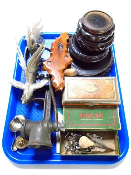 A tray containing Singer sewing machine accessories, vintage mincer, pair of metal cockerel ornaments, carved hardwood Chinese vase stands.