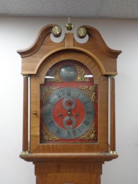 A continental oak longcase clock with brass and silver dial signed Christian Wiuvel with pendulum and weights