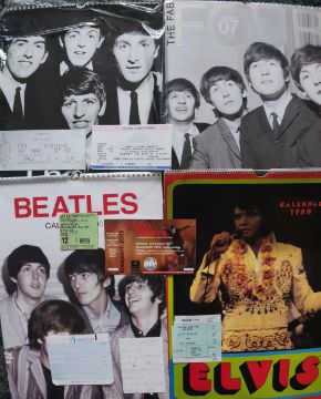 A collection of Beatles and Elvis Presley calendars, and vintage concert tickets from Frank Zappa, Robbie Williams, Cliff Richard and Shirley Bassey.