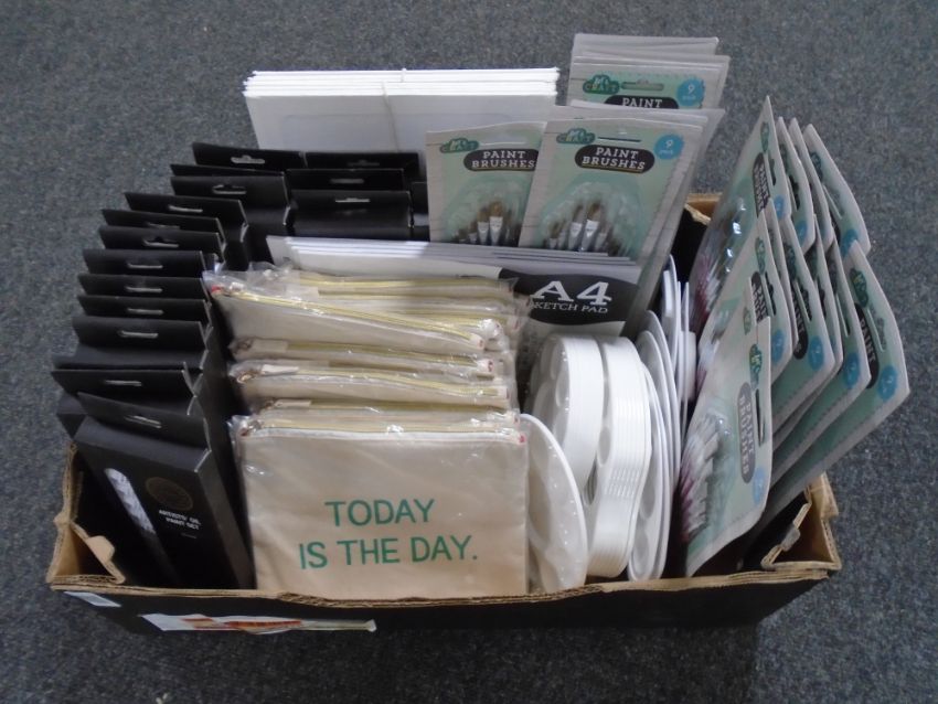 A box containing art supplies including Colvin & Co oil paints, paintbrushes, paint palettes, sketch pads, brush bags. (new)