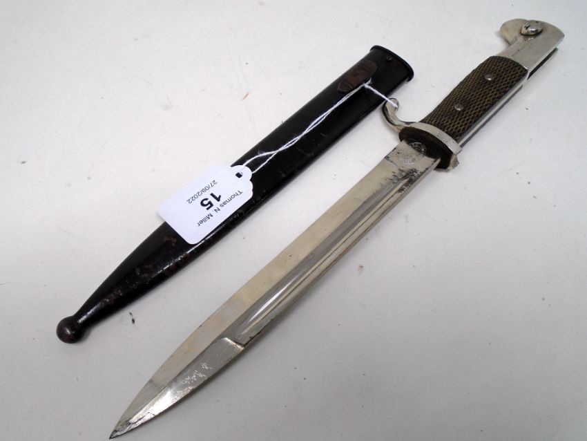 A German Third Reich K98 Parade bayonet, 7.5" blade stamped F.W. Holler, Solingen, in black painted metal scabbard