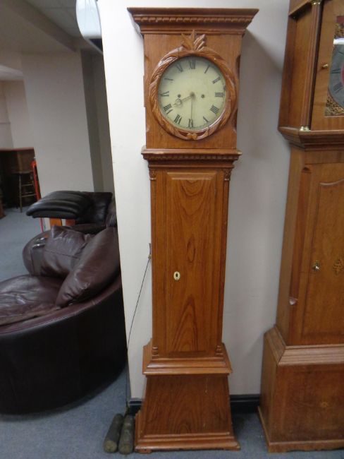 A continental pine longcase clock with painted dial, pendulum and weights