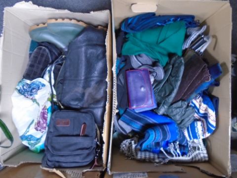 Five boxes of gent's clothing, scarves, gloves, Wellington boots, towels etc