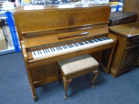 A walnut cased overstrung piano by Squire and Longsone together with storage piano stool