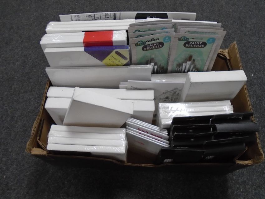 A box containing art supplies including Colvin & Co acrylic paints, canvasses, sketch pads, brushes etc.