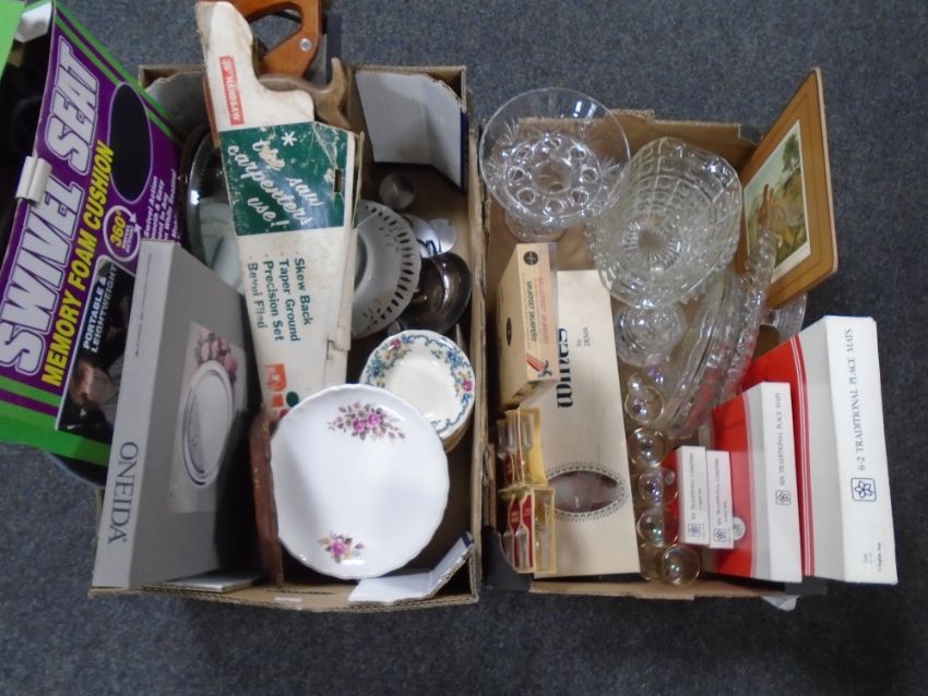 Two boxes of traditional place mats, glass ware, vintage hand saws etc
