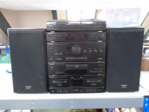 A Technics five piece HiFi separates system with speaker and box of leads.