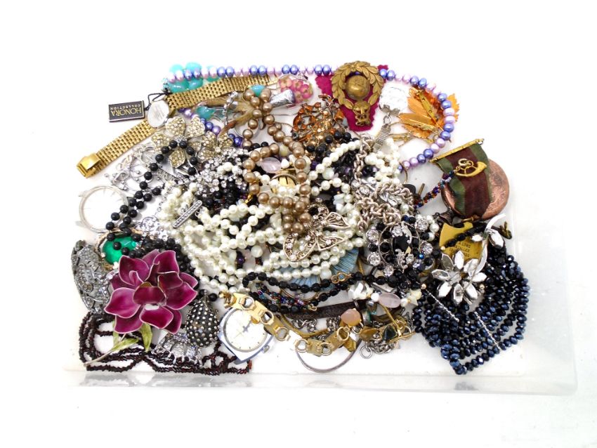 A plastic tub containing a quantity of assorted costume jewellery, contemporary pocket watch, watch face, Freemason's medal, military badge etc.