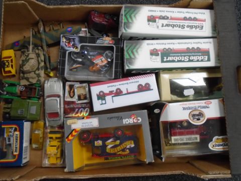 A box containing boxed and unboxed die cast vehicles including Atlas, Eddie Stobart, Corgi classics, matchbox etc.