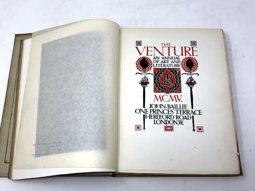 Arthur Rackham, 1867 - 1939 (Illustrator) : The Venture 1905 - An Annual of Art and Literature, a volume, hardbound, pictorial cloth, 194 pages, printed by The Arden Press Ltd., published by John Baillie, 1905. Note : This rare edition includes an original etching by Frank Brangwyn, an original woodcut by Frank Brangwyn and other interesting illustrations in varying formats.