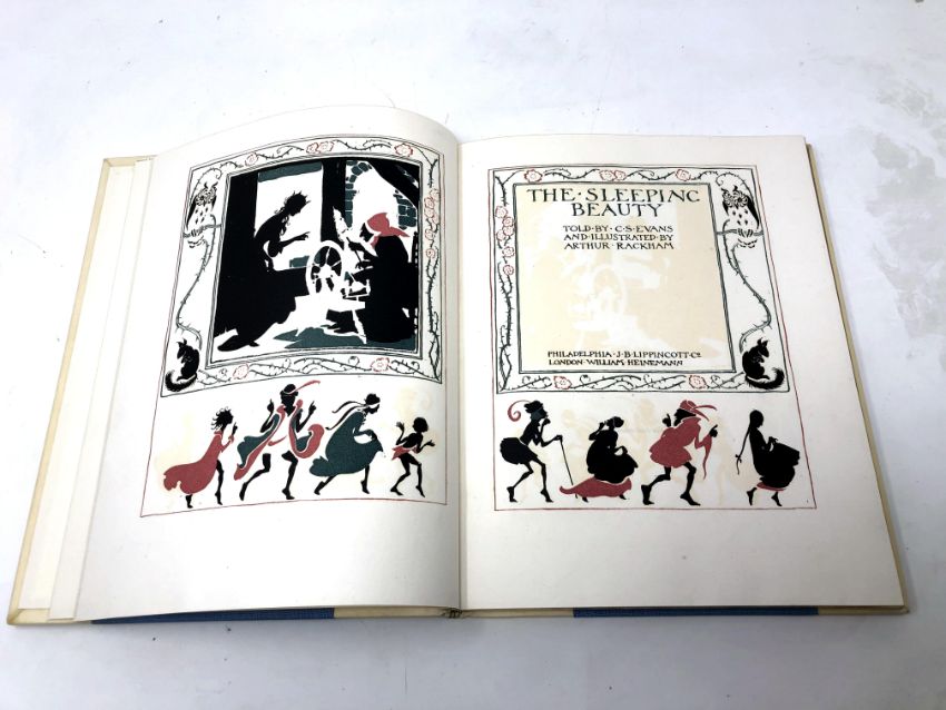 Arthur Rackham, 1867 - 1939 (Illustrator) : The Sleeping Beauty, told by C.S. Evans, a volume, signed by Arthur Rackham, numbered 571 from the edition of 625 copies, 4to r bound with blue cloth and cream vellum, 110 gilt-edged pages, with blue cloth slip case, published by William Heinemann, 1920.