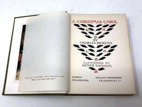 Arthur Rackham, 1867 - 1939 (Illustrator) : A Christmas Carol by Charles Dickens, a volume, hardbound, green cloth, 146 pages, published by William Heinemann, 1915.