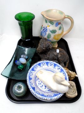A tray containing a Royal Doulton Brangwyn ware jug, glass vase and eggs, iridescent apple paperweight etc.