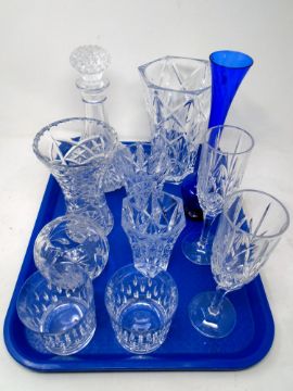 A tray containing assorted glassware including a pair of Galway crystal whisky tumblers, ship style decanter, a pair of champagne flutes, glass vases etc.