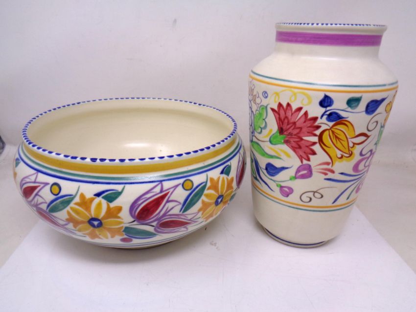 A Poole pottery fruit bowl (diameter 24cm) together with a similar Poole vase.
