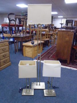 A contemporary brass floor lamp with shade together with a pair of matching table lamps.