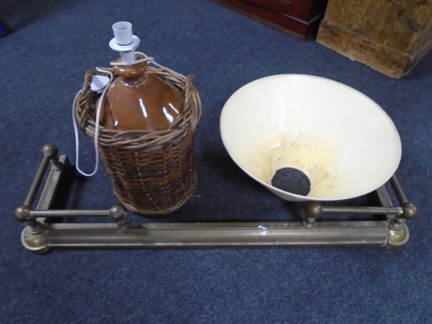 A 19th century brass fire fender (AF) together with a vintage stoneware flagon in wicker basket converted to a table lamp.