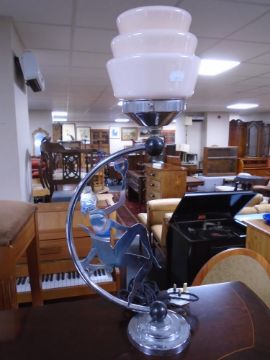 A chrome Art Deco table lamp with pink glass shade (height 57.5cm)
