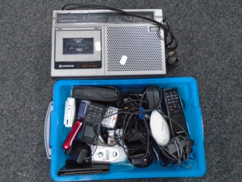 A Hitachi radio cassette player together with a box containing assorted mobile and house phones including Sony Ericsson, Samsung, Panasonic etc.