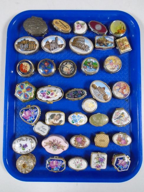 A tray containing a collection of metal and porcelain trinket boxes.