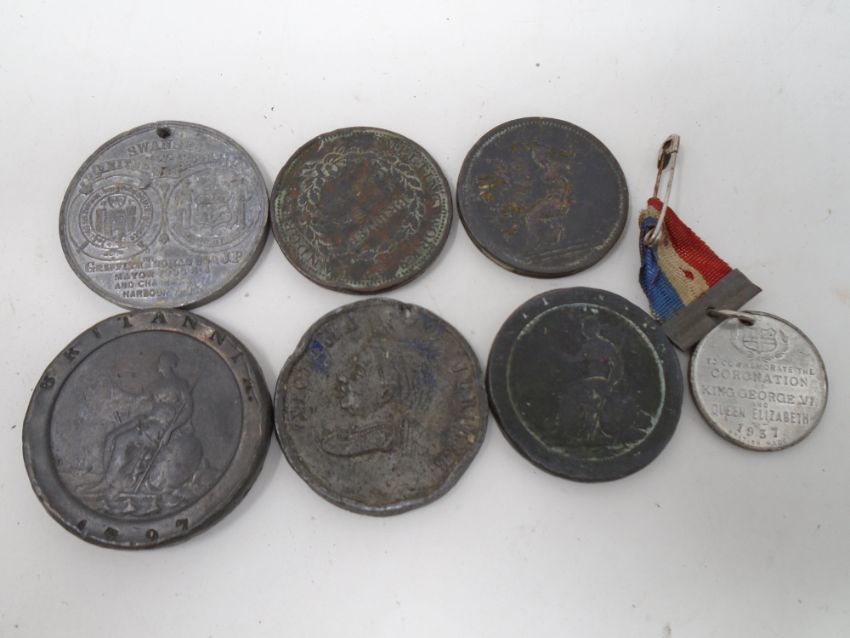 A bag containing George III pennies including Cartwheel penny, British Copper Company medal, Queen Victoria, George VI and Edward VII coronation medals.