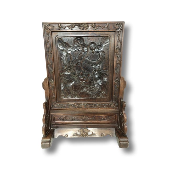 A Chinese hardwood table screen with carved dragon decoration, height 63 cm, width 46 cm.