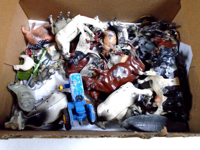 A box containing a quantity of mid-20th century hand painted lead animal figures.