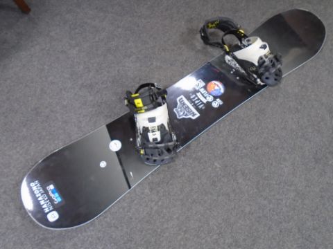 A snow board with bindings.
