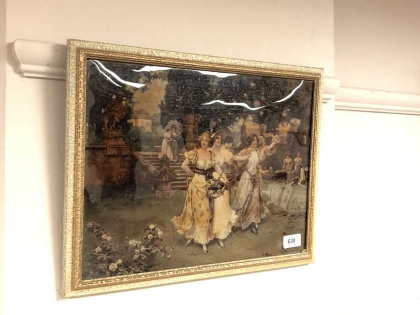 An antique crystoleum depicting figures in a garden, (38cm by 29cm).