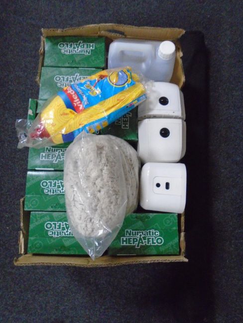 A box containing Numatic hoover bags, hand sanitizer machines, mop heads together with a set of drain rods in carry bag.