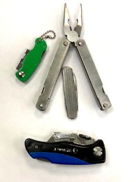 A folding pocket multi tool together with three folding pocket knives
