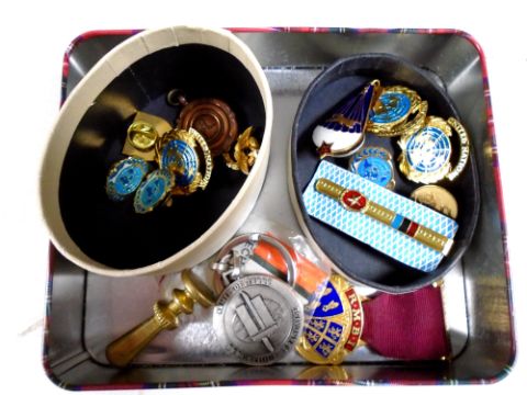 A tin containing United Nations enamelled badges, Steward medal, brass seal, Whitley Bay running medal etc.