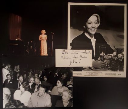 An autograph of Marlene Dietrich and photos of her in the 1960's and the 1970's.