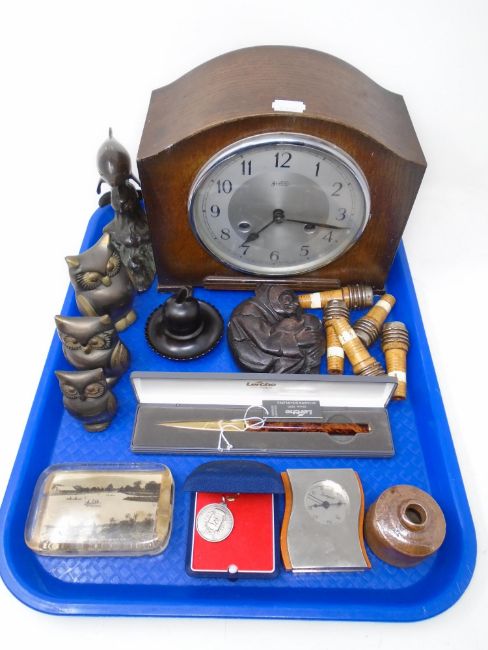 A tray containing Bentima oak cased mantel clock, boxed Lerche letter knife, glass paperweight, ornaments etc.
