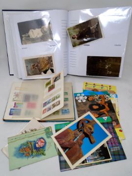 A tray containing an album of antiquarian and later postcards, a stamp album of world stamps etc.