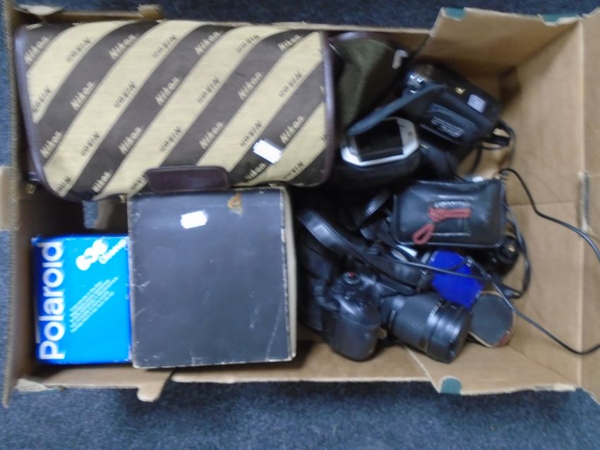 A box of assorted cameras and related equipment including Fujifilm Finepix s200exr camera, Polaroid Super Swinger land camera in original box etc.